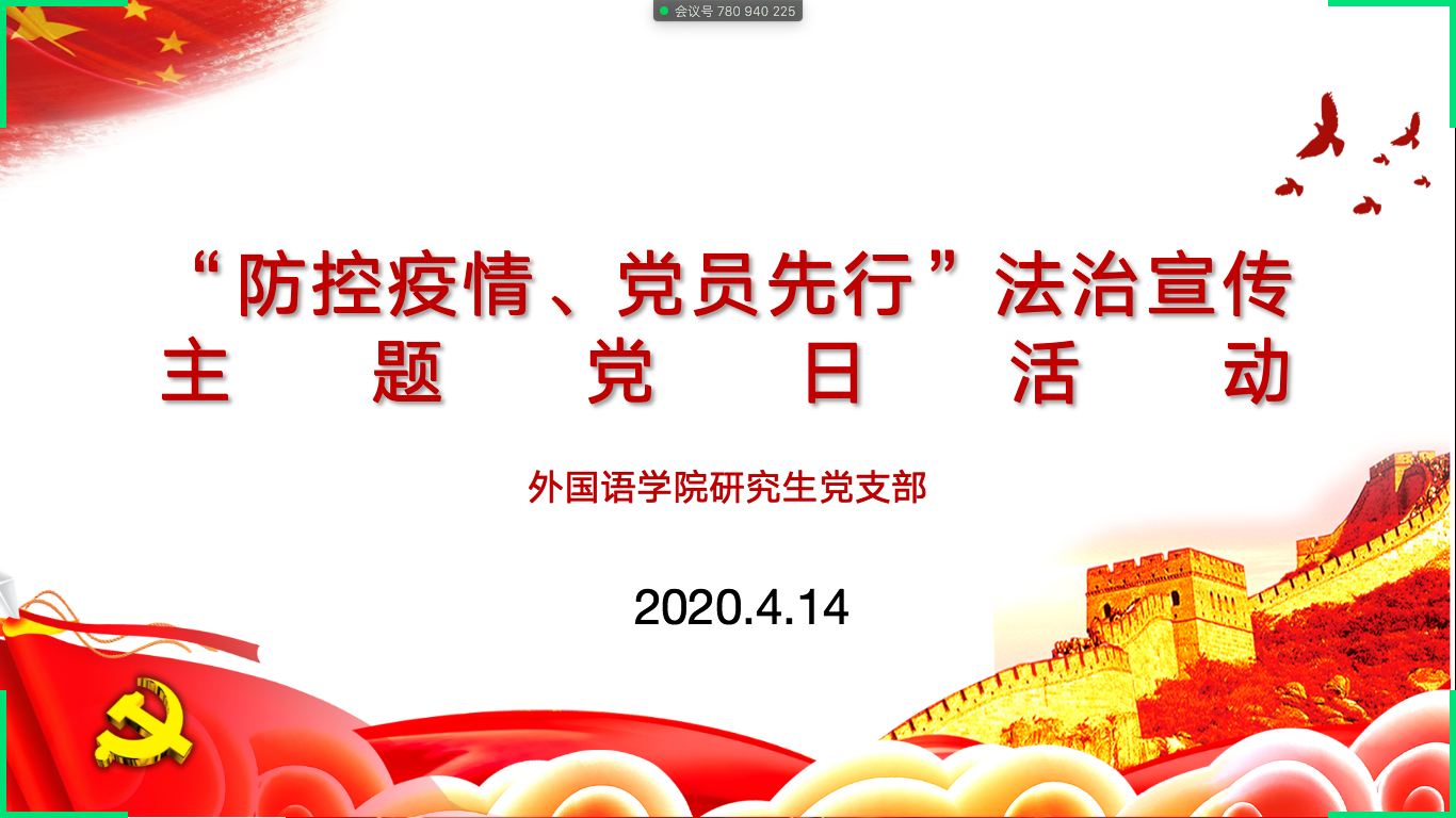 4月14日,太阳成集团tyc33455cc官方网站研究生党支部开展了以“防控疫情、党员先行”为主题的在线党日活动,支部全体成员参加活动,会议由支部书记籍天璐主持。
