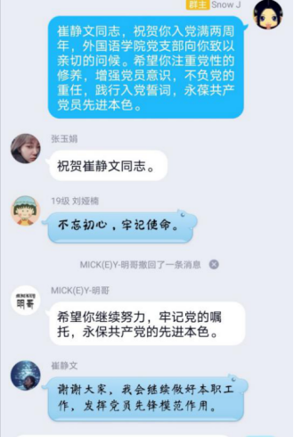 随后,刘娅楠同志作了题为《身边的榜样》的微党课。党课讲述了农民铁人范振喜、人民好公仆焦裕禄和恪守风格的太行愚公李保国等先进党员的故事。她号召广大党员要以榜样为力量在生活中充分发挥先锋模范作用。活动最后,支部为崔静文同志过了政治生日,她回顾了自己的入党经历并表示自己将会坚定入党初心,继续前行,争做一名优秀党员。