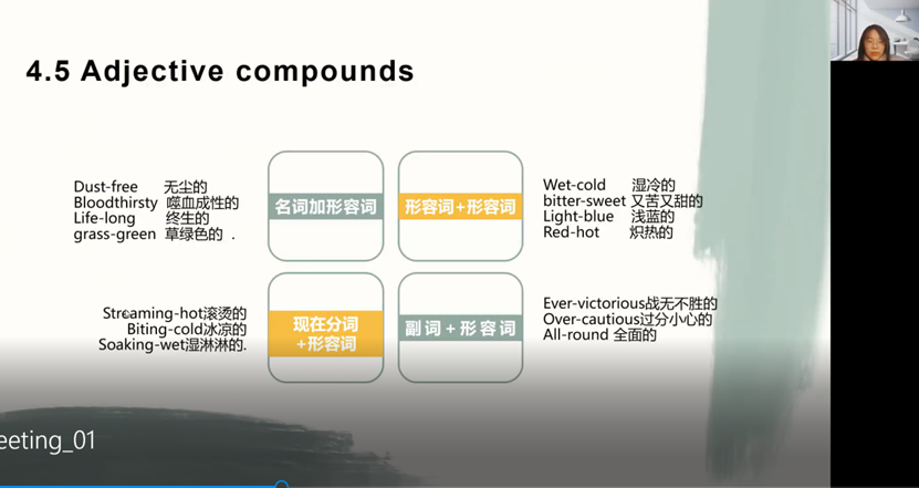 2022级学科英语研究生冯婷婷同学为大家做 Morphemes and Morphological Process《词素与词的形成》的知识分享。通过她耐心细致地讲解,各位本科同学回顾了本科期间修习的语言学和词汇学的相关课程。她的讲解提到了大量的词汇构成知识,进一步扩充了大家的词汇量以及词汇学的相关知识。其全面查阅相关资料细心收集汇总制作PPT,使参会的师生颇受启发。