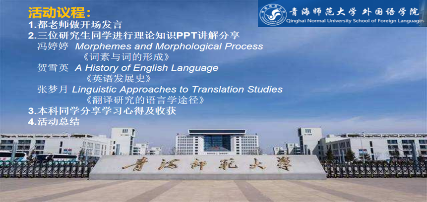 2022级学科英语研究生贺雪英同学为大家做了 A History of English Language《英语发展史》的知识分享。她精彩的讲述让同学们从英语的起源、英语发展的四个时期和英语的与时俱进三个方面对英语发展史有了系统深入的了解。