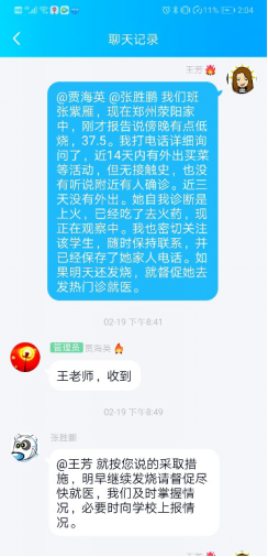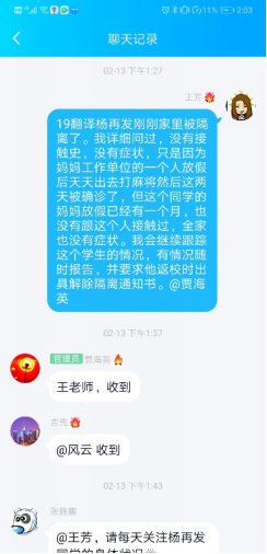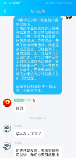 在做好疫情防控工作之外,她也一如既往地做好与员工的谈心谈话工作。假期中,有同学家庭发生了矛盾,她认真聆听员工的倾诉,在情绪上进行安抚和疏导;有的同学感情受挫,她又化身知心大姐,帮助同学走出心情低谷。当注意到有同学因为延期开学及网络授课而出现焦虑和不满情绪时,王老师深入了解同学们遇到的问题,给出解决问题的建议和意见,帮助排解负面情绪,做好防疫动员宣传工作。