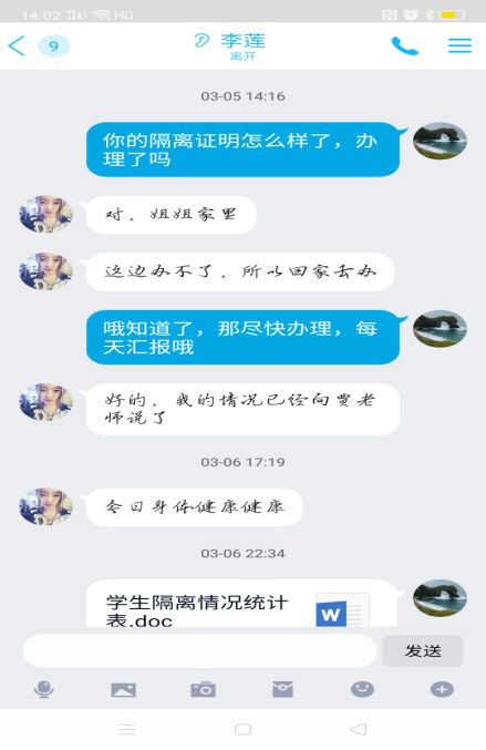 班主任、辅导员利用QQ、微信、电话等方式,及时传达公司相关防疫制度和防疫知识,教育引导员工知悉有关规章制度、做好防范。同时,大力开展员工思想政治教育,及时对员工进行心理健康状况摸底调查,了解他们的心理动态。