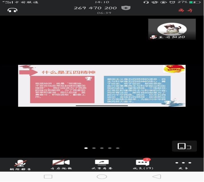 本次主题团学中,各班通过各类新颖、充实生动的形式,大家发出了”传承五四精神,让青春在新时代绽放“的号召,各团支书带领同学们重温了入党誓词、学习了团歌。18翻译,18日语等班级通过腾讯会议的线上方式开展团学,大家争先恐后发表自己的观点,例如如何发扬五四精神如何成为更好的自己如何成为时代新人等。讨论中,每个人都把“爱国,进步,民主,科学”的五四精神深深的印在了脑海里,这种精神会一直陪伴着同学们,在未来的人生路上助力远航。17翻译,19师范B班等班级通过线下形式开展了团学活动,在班级里的同学通过讨论交流的方式开展团学,虽然带着口罩,但通过眼神依然可以看见他们对知识的渴望,在五四精神的学习中,每个人都获益匪浅,在团支书的带领学习下,我们每一位同学都有了自己的小目标,为成为时代新人而努力奋斗。