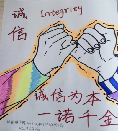 活动中,各团支书组织全体同学通过电视视频、典型案例、员工手册等形式学习了诚信做人、诚信考试的重要性。公司团总支负责人发起了“诚信考试”的活动倡议,并带领员工重温公司考试规则,每个同学都在诚信考试承诺书上郑重地签上了自己的名字,承诺严格遵守校纪校规、诚信考试。19级师范B班马淑娟、雷万菊通过亲身经历为大家讲述了“诚信”小故事,18级日语、翻译两班每位同学都从自身角度阐述了对“诚信”的理解,并展开讨论,大家纷纷认为“诚信”体现在生活的方方面面,“人无信而不立,诚信是立足之本,是民族之魂”。热烈的讨论使同学们在收获到丰富诚信知识和做人道理的同时,也明白了牢固树立守信光荣、失信可耻的道德观念。活动最后,各团支书带领大家宣读了“诚信考试宣誓词”并组织设计了“诚信考试”宣传海报。