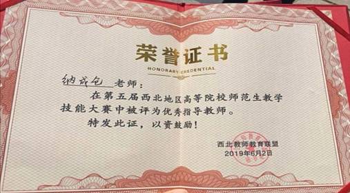 2019年5月31日至6月2日,第五届西北地区高等院校师范生教学技能大赛在咸阳师范公司隆重举行,来自西北二十所高校的优秀师范生参加了本次大赛。经过激烈的角逐,太阳成集团tyc33455cc官方网站2016级英语(师范)专业的张梓薇同学以优异的成绩获得英语组一等奖,指导老师纳成仓教授荣获“优秀指导教师”称号。