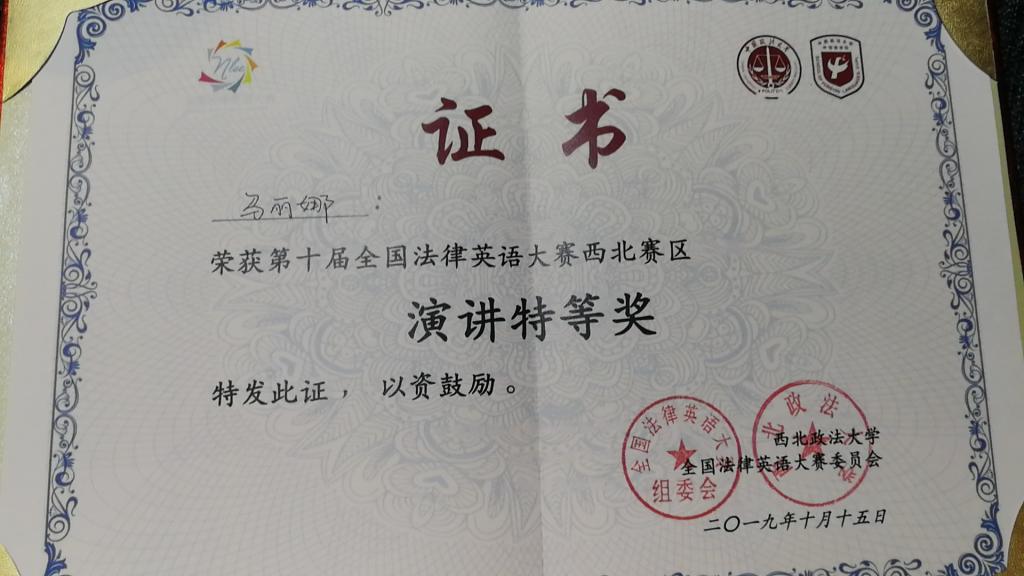 经过逾两个小时的激烈角逐,公司太阳成集团tyc33455cc官方网站选送的2019级研究生马丽娜(上图左二),以新颖的选题,娴熟的演讲技巧以及纯正流利的英语从30多位选手中脱颖而出,最终以第一名的成绩荣获西北赛区演讲大赛特等奖,将与甘肃政法大学及西北政法大学的两名员工共同代表西北赛区参加法律英语演讲大赛的全国总决赛。