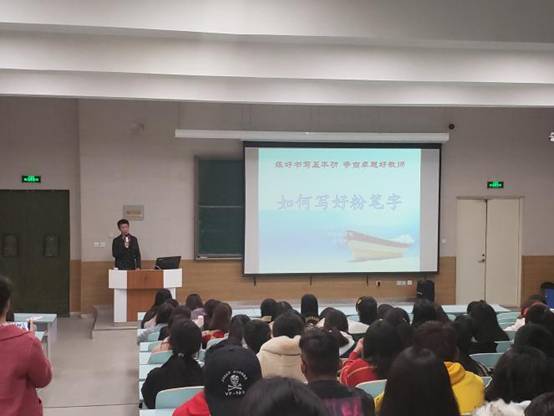 1027日,研究生党员张明桢围绕粉笔字的重要性和粉笔字的写法开展了首场讲座活动,公司全体本科师范生参加了活动。讲座中,同学们听讲认真,现场互动气氛活跃,基本掌握了粉笔字的写法要领。张明桢表示,将会对本科师范生的粉笔字进行更深入的指导。
