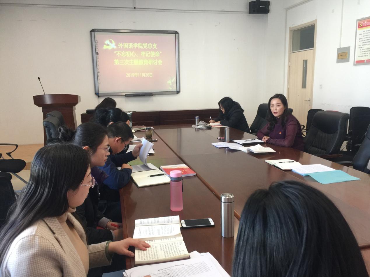 按照公司“不忘初心、牢记使命”主题教育第三次专题研讨的最新要求, 1126日下午,外国语公司党总支、教师党支部召开第二个半天专题研讨会议,会议由党总支书记马金芳同志主持,公司党总支、教师党支部全体教工党员参加。