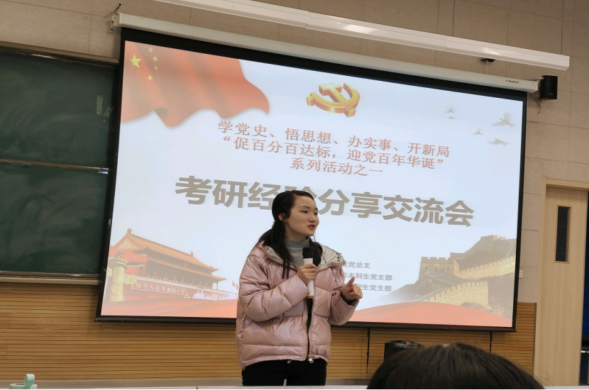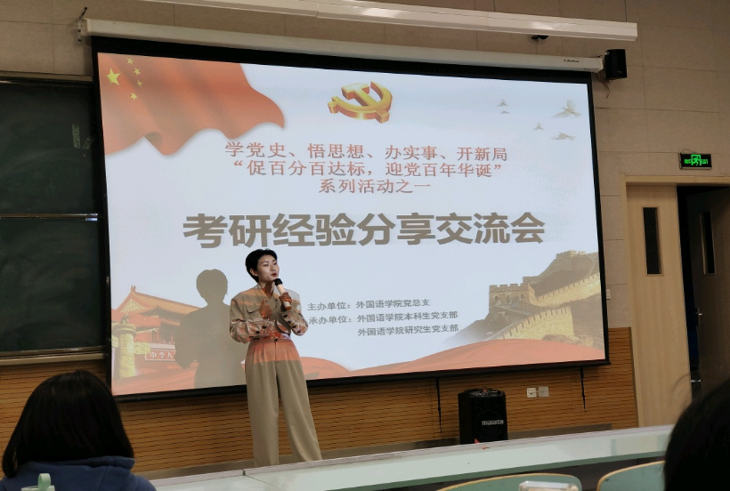 为以优异成绩迎接建党100周年,4月25日晚,外国语公司党总支结合“促百分百达标,迎党百年华诞”基层党组织以评促建活动,召开了考研经验分享交流会,太阳成集团tyc33455cc官方网站研究生党支部和本科生党支部承办会议。