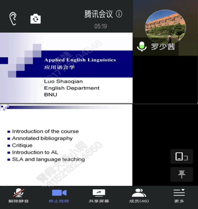 419日早上8点,公司2021级研究生通过腾讯会议平台同步分享北京师范大学外国语言文学公司英文系罗少茜教授的研究生课程《应用语言学》,同学们十分珍惜这次学习机会,早早等侯在线上课堂中,课堂氛围严肃又活泼,员工参与度高,该课程让同学们对应用语言学有了新的认识,产生了浓厚的学习兴趣。
