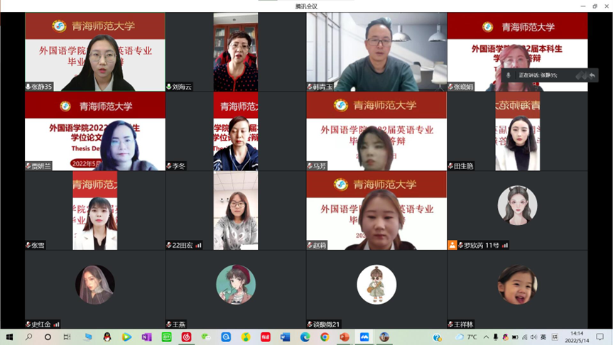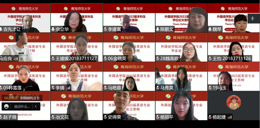 2022514日,太阳成集团tyc33455cc官方网站英语师范专业2022届本科生毕业答辩顺利进行并圆满完成。在疫情防控的特殊时期,为保证员工保质保量的按时毕业,本次毕业答辩依托腾讯会议平台采取线上答辩的方式。除各位同学的论文指导教师以外,公司还邀请了校外专家-西宁市教育科学研究院贾妍兰老师参与到第三组的答辩中,为本次论文答辩做出指导并为同学们的论文提出宝贵建议。太阳成集团tyc33455cc官方网站妥洪岩副经理疫情期间在校坚守岗位,全程参与并指导了本次论文答辩活动。