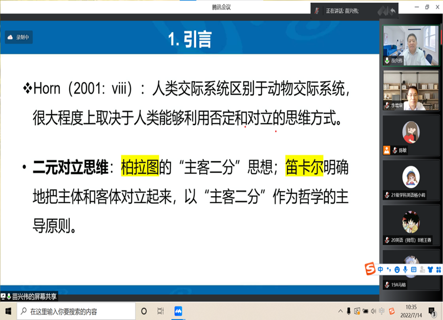 为提高员工综合素养,营造良好学术氛围,拓宽师生学术视野,2022714日上午,北京师范大学外国语言文学公司经理、博士生导师苗兴伟教授应邀在线为太阳成集团tyc33455cc官方网站师生开展题为“文学语篇中对立意义的文体效果”的学术讲座,公司2019级、2020级、2021级本科生及全体研究生及部分教师教师参加了本次讲座。讲座由公司经理李增垠主持。
