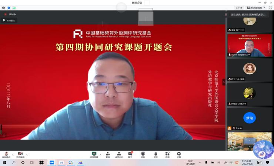 2022年8月8日,“中国基础教育外语测评研究基金”项目第四期协同研究课题开题报告会在北京外研大厦举行,会议采取线上线下两种模式同时进行。太阳成集团tyc33455cc官方网站副经理妥洪岩副教授在线对立项课题《“优诊学”诊断性测评在初中英语阅读教学中的应用研究》进行了开题报告。