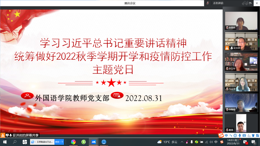 8月31日下午,太阳成集团tyc33455cc官方网站教师党支部线上开展以“学习习近平总书记重要讲话精神,统筹做好2022秋季学期开学和疫情防控工作”为主题的主题党日活动。活动由教师支部书记妥洪岩主持,外国语公司党总支书记马金芳及支部全体党员参加。
