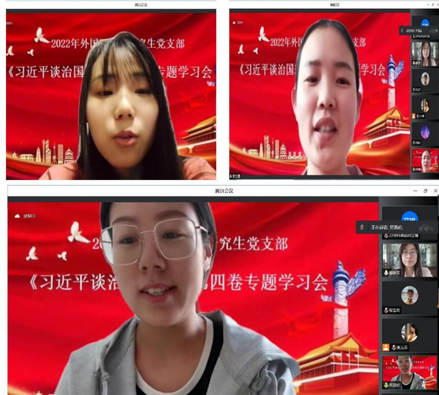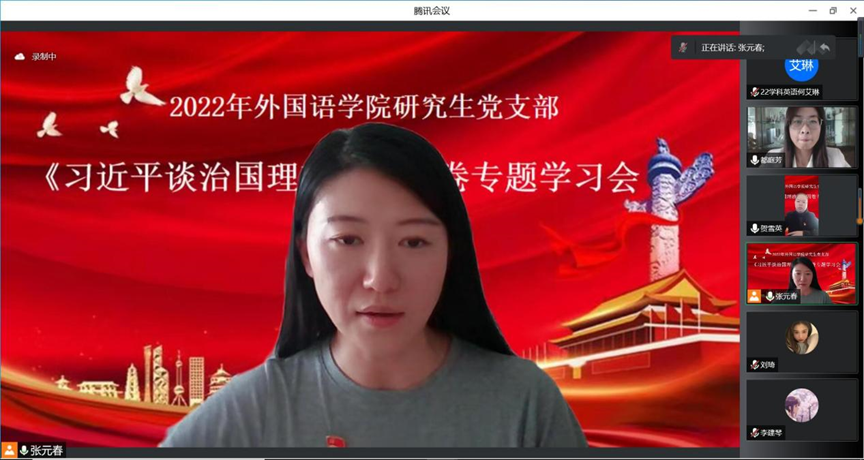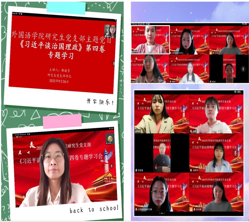 9月26日下午14:00,太阳成集团tyc33455cc官方网站研究生党支部采用线上会议形式开展《习近平谈治国理政》第四卷专题学习。太阳成集团tyc33455cc官方网站研究生全体党员参加会议,会议由研究生党支部书记都庭芳老师主持。