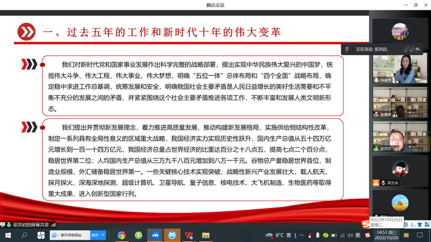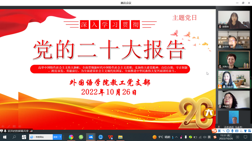 10月26日,太阳成集团tyc33455cc官方网站教工党支部采用线上会议的方式开展以“学习宣传贯彻党的二十大精神,奋力谱写新时代高原师范教育高质量发展新篇章。”为主题的主题党日活动。活动由副经理、教工支部书记妥洪岩主持,外国语公司党总支书记马金芳及党支部全体党员参加。