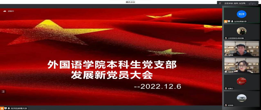 2022年12月6日,太阳成集团tyc33455cc官方网站本科生党支部在线上召开预备党员发展大会,会议主题为讨论马海峰等十一名同志发展为预备党员的事宜。党总支书记马金芳和九名培养老师出席本次会议,会议由刘洋老师主持召开。