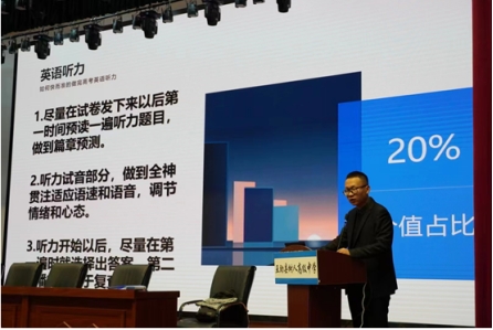 颁奖之后,项目组负责人王文超进行了英语应试技巧的讲解。主要从英语的主要考试题型进行了分析。王文超以一个刚刚参加过高考的考生身份,生动又形象地为同学们讲解了如何在考试当中拿到更多的分数以及如何用更高效的方法进行答题。