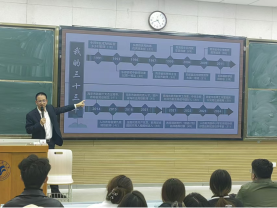 10月25日,太阳成集团tyc33455cc官方网站邀请海东市第一中学周全中董事长为公司师生做题为“热爱燃梦想,专业铸尊严”卓越教师培训讲座,太阳成集团tyc33455cc官方网站经理助理韩青玉、22级和23级全体本科生聆听讲座讲座由学科教学教研室主任李霞主持