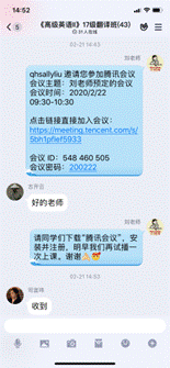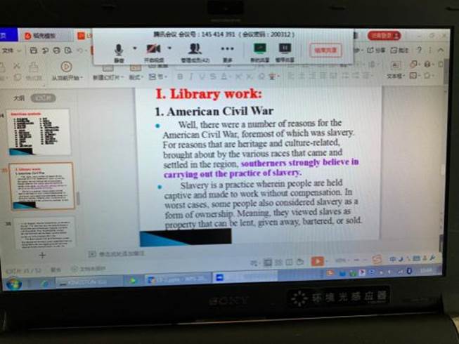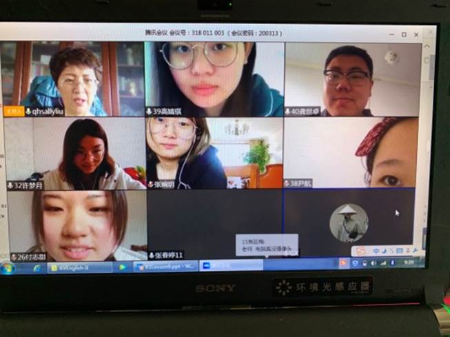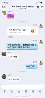为做好在线教学,从一月底就开始,刘海云老师积极参加公司组织的在线教学培训,认真总结公司推荐的各大在线教学平台优缺点。例如,雨课堂直播效果好,且能回放,但极容易崩溃,在培训的时候就领教了它的厉害,所以只能作为课堂互动的辅助平台;腾讯会议虽不支持课堂回放,但平台稳定性强,不容易卡顿,语音教学比较流畅;QQ群语音通话效果良好,但不方便屏幕共享。通过多次测试与比较,我确定了自己的教学方式:腾讯会议+QQ群+批改网。同时,我在开学前对本学期所带的专业课《高级英语II》分别建立了课程QQ班群及微信班群,提前准备课程大纲、课件、教案和教学进度计划表,不断熟悉腾讯会议、QQ群课堂等平台操作运用,分别组织了多次模拟授课测试,精心制作多个在线教学预案,并及时推送和下载了与课程密切相关的中国大学MOOC上学习资源资料。