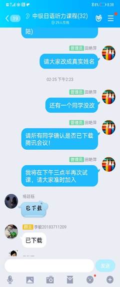 结合《口译基础》课程特点,我利用腾讯会议进行在线直播教学、QQ课程群进行辅导答疑与作业批改。同时,推荐中国大学MOOC相似课程作为员工课后补充学习资料。
