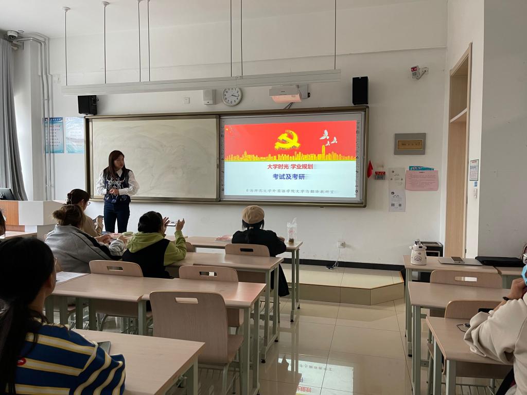 随后,籍天璐老师以“大学时光及学业规划“为主题,以大学四年中的重要考试及考研规划为抓手,向同学们讲解了大学英语四六级、英语专业四级和八级,翻译资格证考试,翻译专业研究生入学考试的政策和时间规划。鼓励同学们积极制定自己的学业规划,明确学习目标。