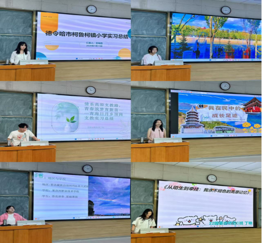 随后,22级三个班的六位同学分别上台分享了自己的顶岗支教经历。来自22A班的支锦霞和马秀芬同学在德令哈支教,她们从多样的角度阐述了此次支教遇到的困难,以及自己克服困难之后的收获。来自22B班的肖丁硕同学在湟源县日月藏族乡中心公司,马晓彤在化隆县民族中学支教,他们为我们讲述了多民族公司的特点、自己面对多民族员工群体时采用的多样教学方法,以及如何把民族团结意识融入教学之中。来自22C班的丁艳和吴建清同学的支教地点在果洛州玛沁县,他们讲述了员工的真诚、善良、与淳朴,和初入高海拔地区工作的适应过程。