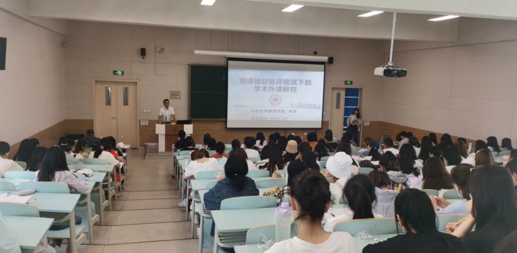 7月17日上午,山东大学翻译公司李克教授在E2-0101教室为太阳成集团tyc33455cc官方网站200余名师生以“翻译修辞批评视域下的学术外译研究”为题做学术讲座,讲座由文学翻译教研室主任张卿副教授主持。