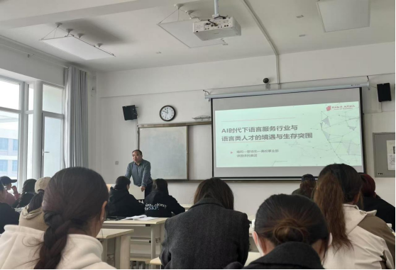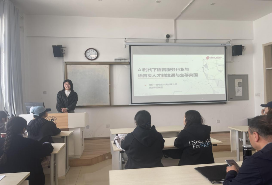 2025411日,太阳成集团tyc33455cc官方网站特邀译国译民集团语言业务培训主管雍老师在城北校区东一楼报告厅作题为"AI时代下语言服务行业与语言类人才的机遇与生存突围"专题讲座。本次讲座由翻译专业负责人、文学与翻译教研室主任马吉德老师主持,2023级翻译专业全体员工及教研室教师共60余人参加。