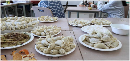 在冬至当日,同学们一大早就出发到西宁市区购买肉类,蔬菜和水果。为了让外地同学体验青海特色,此次活动还专门准备了特色清真食品:馓子。中午十二点,食材已经就绪,各种调料也已经备齐,由殷老师亲自操刀拌馅,同学们协助切菜,共同包饺子,体验冬至氛围。很多同学都是第一次包饺子,手法虽然不熟练,但包的饺子也是有模有样,很多同学还尝试了花式包饺子,做出了形状各异的水饺。