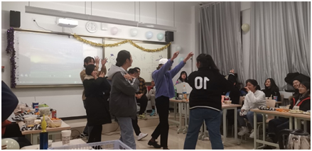 最后在公司生活区清真餐馆的帮助下,同学们终于吃上了自己动手包的水饺。之后,同学们还表演了自己精心准备的节目,有相声、小品、个人独唱、宿舍合唱、群舞、独舞等,还有击鼓传花,你来比划我来猜等集体游戏,再加上同学们妙语连珠的主持,整个活动一片欢声笑语,好不热闹!期间,同学们的任课教师李霞老师送来了可口的小吃。最后由辅导员殷春兰老师和班主任王芳老师进行了总结,对我们此次活动表示了肯定,鼓励我们在学习上也要有干劲!活动结束后,同学们一起打扫教室,整理物品,保持了教室的卫生整洁。